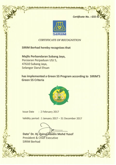 5S HIJAUTahniah dan syabas diucapkan kepada warga kerja MPSJ di atas hasil usaha dan komitmen yang diberikan sehingga MPSJ memperolehi pensijilan berikut :- Pensijilan 5S Hijau daripada pihak SIRIM STS Sdn. Bhd. Language MS