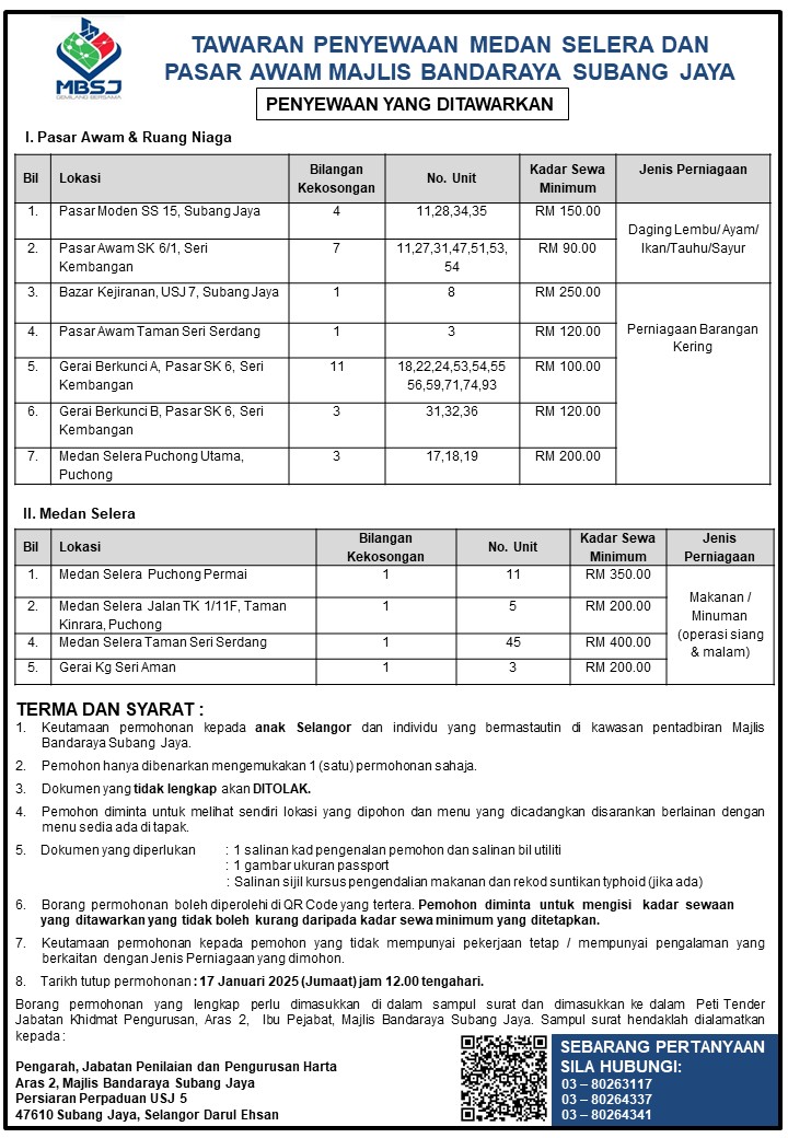 Tawaran Penyewaan Medan Selera & Pasar Awam MBSJ Januari 2025