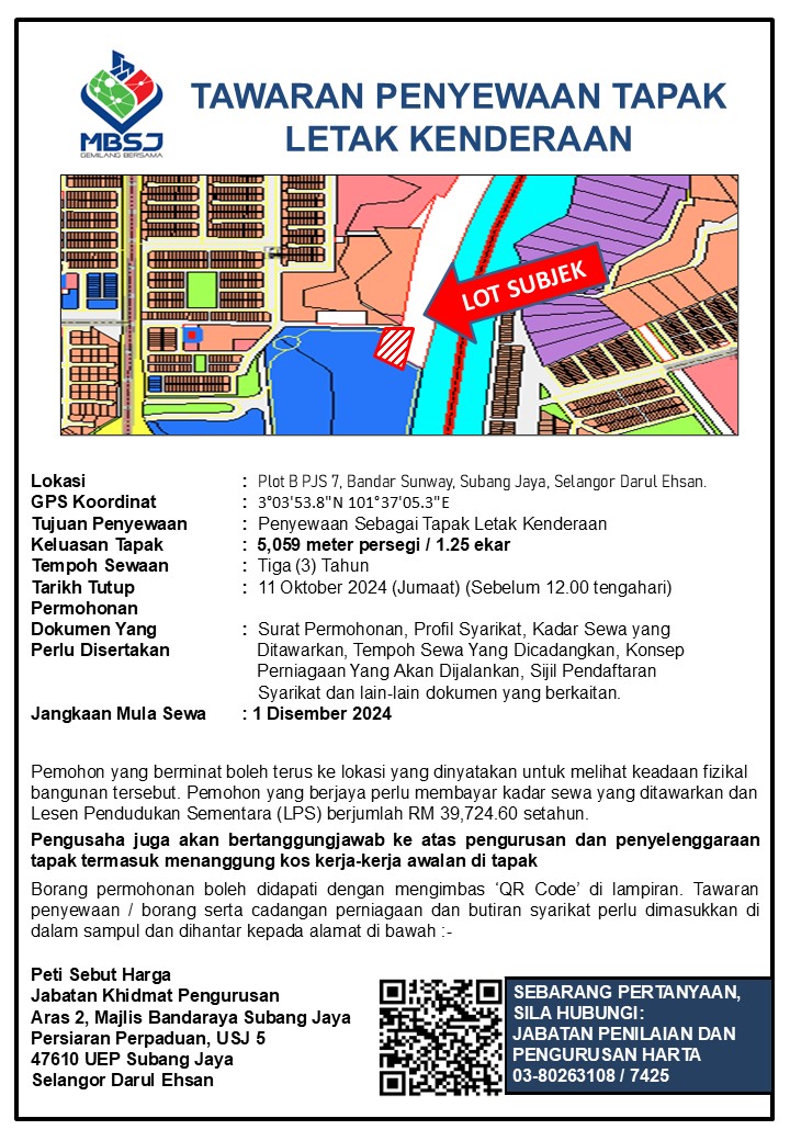 Tawaran Penyewaan Tapak Letak Kenderaan Bagi Tanah Bawah Rentis (Rizab Tnb) Berkeluasan 1.25 Ekar Beralamat Di Pjs 7, MBSJ